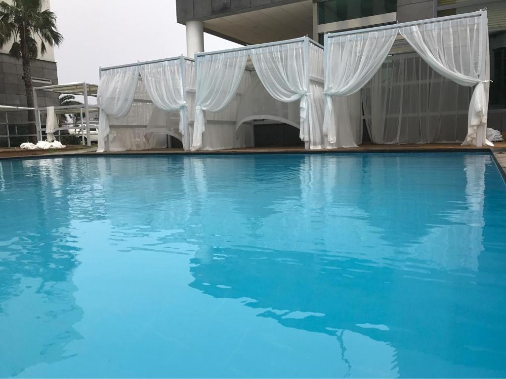 The pool is open until 10 PM, so you might be able to have dinner and use the pool if you arrive at the airport late. We were planning to use it too, but since the kids didn't want to, we had dinner and took a walk instead, but it's close to the airport and nice.