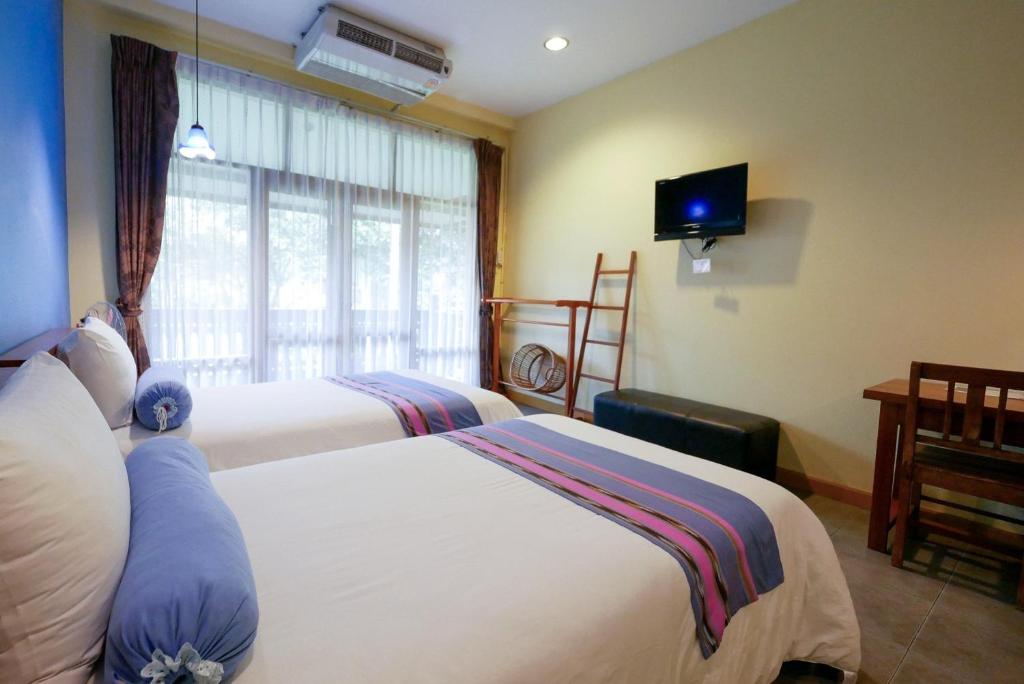 At Auangkham Resort, we strive to provide our guests with a comfortable and convenient stay. Each of our well-appointed rooms is equipped with modern amenities to ensure a memorable experience. Step into a haven of relaxation as you enter your room, where you'll find air conditioning to keep you cool and comfortable throughout your stay. Sit back and unwind in front of the television, catching up on your favorite shows or enjoying a movie night in.