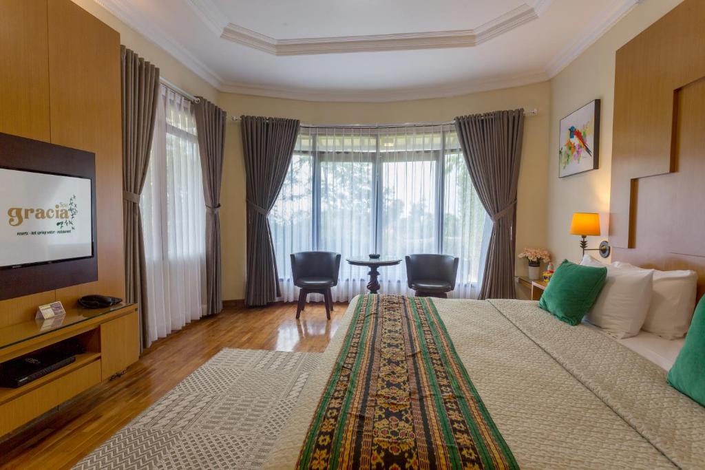 Das Gracia Spa Resort in Bandung bietet seinen Gästen eine exquisite Auswahl an Zimmern, die mit modernen Annehmlichkeiten ausgestattet sind, um einen unvergesslichen Aufenthalt zu gewährleisten. Jedes Zimmer verfügt über einen eigenen Balkon oder eine Terrasse, die Ihnen einen atemberaubenden Blick auf die umliegende Natur bietet und den perfekten Ort zum Entspannen nach einem langen Tag darstellt. Der gemütliche Kamin sorgt für eine warme und einladende Atmosphäre, während Sie sich in den bequemen Möbeln zurücklehnen und die Ruhe genießen können.