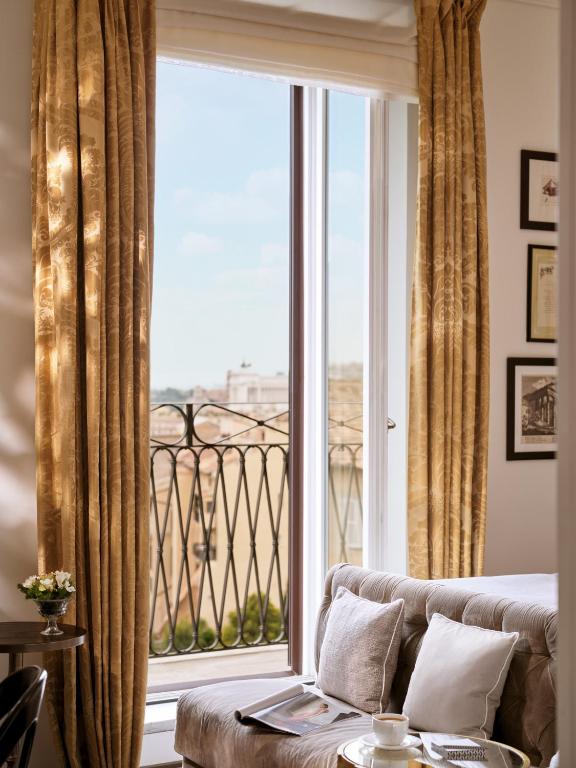 Una de las características más destacadas de las habitaciones es la presencia de una chimenea, que añade un toque de intimidad y calidez. Este elemento no solo proporciona un ambiente acogedor durante las noches frescas de Roma, sino que también crea un escenario perfecto para momentos de reflexión o una lectura placentera. Con un diseño que respeta la rica historia del hotel, cada rincón de las habitaciones está cuidadosamente decorado, ofreciendo un equilibrio perfecto entre lo clásico y lo contemporáneo, asegurando que cada estancia sea verdaderamente especial.