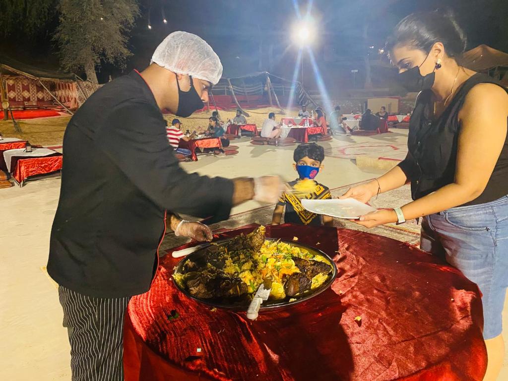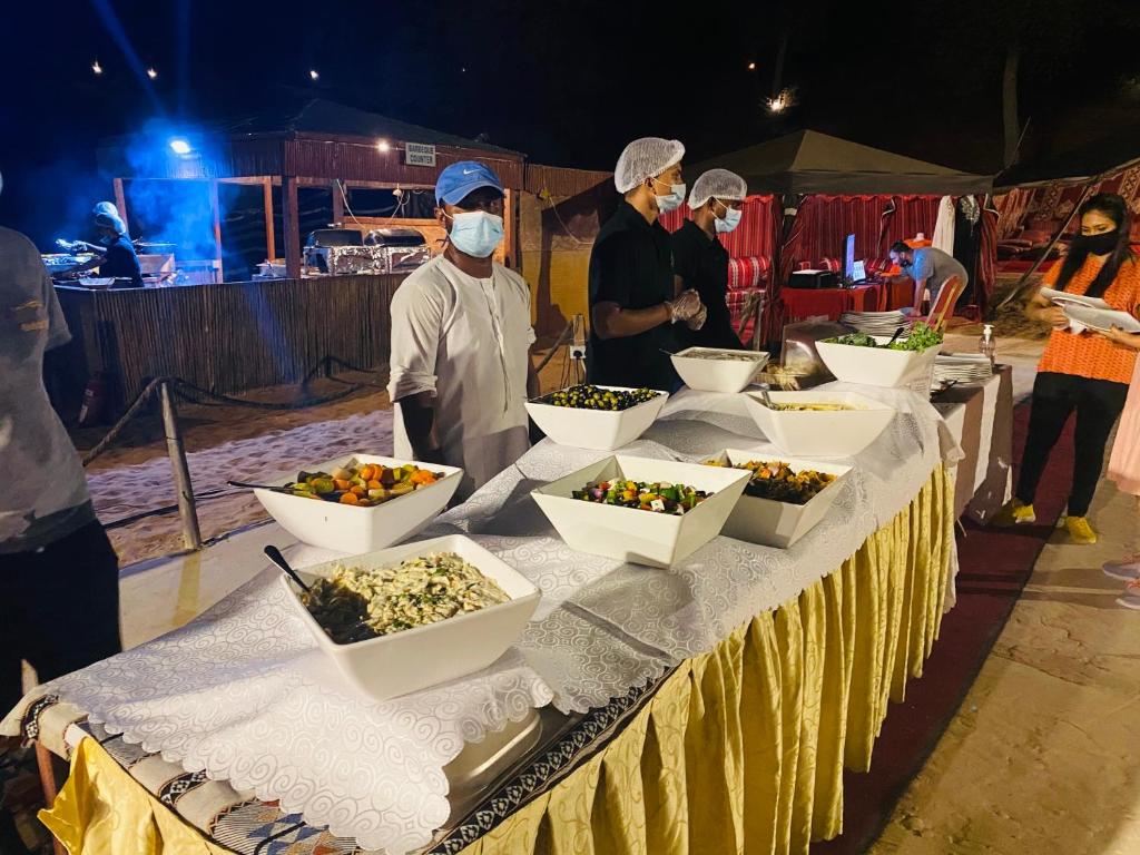 Bedouin Oasis Camp tarjoaa vierailleen unohtumatonta ruokailukokemusta, joka yhdistää perinteiset makunautinnot moderniin mukavuuteen. Hotellin ravintola on suunniteltu tarjoamaan herkullisia halal-ruokia, jotka houkuttelevat niin paikallisia kuin kansainvälisiä vieraita. Aamuisin vieraat voivat nauttia runsaan aamiaispöydän antimista, joka sisältää herkullisia kontinenttisia vaihtoehtoja. Aamiaisen jälkeen on täydellinen hetki nauttia kupillinen tuoretta kahvia hotellin viihtyisässä kahvilassa, joka tarjoaa rauhoittavan ympäristön rentoutumiseen ja ystävien tapaamiseen.