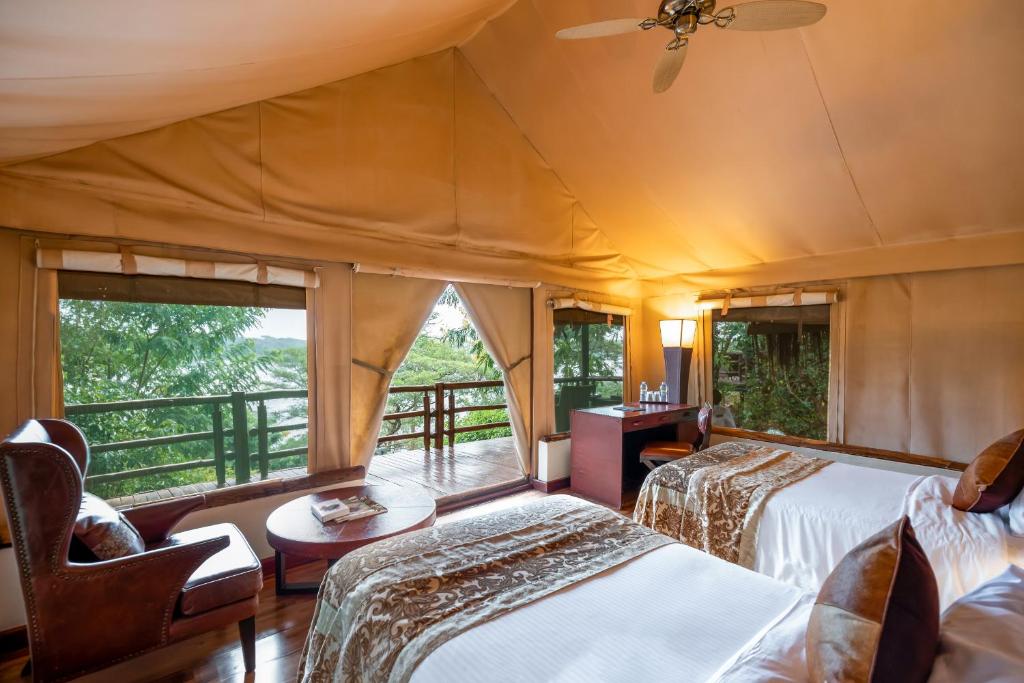 Chobe Safari Lodge tarjoaa vierailleen monipuolisen valikoiman huoneita, jotka on suunniteltu tarjoamaan mukavuutta ja tyyliä. Deluxe-huoneet, jotka kattoavat 44 neliömetriä, tarjoavat vaihtoehdot kahdelle puolikaksosängylle tai yhdelle queen-size sängylle. Seikkailunhaluisille on tarjolla Deluxe-teltta, jossa on mukava queen-size sänky. Perheille suunniteltu Family Cottage, joka kattaa 119 neliömetriä, tarjoaa joustavia sänkyvaihtoehtoja kahdelle yksittäiselle sängylle, kahdelle puolikaksosängylle tai yhdelle queen-size sängylle. Ylellinen Presidential Cottage tarjoaa tilaa ja rauhaa, valiten kahden puolikaksosängyn tai yhden king-size sängyn välillä. Standard-huoneet, kooltaan 37 neliömetriä, sekä Standard Double Tent, joka kattaa 71 neliömetriä, täydentävät majoitusvaihtoehtoja. Viimeisenä mutta ei vähäisimpänä, Suite, joka on 67 neliömetriä, tarjoaa tilavan ympäristön rentoutumiseen. Chobe Safari Lodge on täydellinen valinta kaikille, jotka etsivät ainutlaatuista majoituskokemusta Ugandan sydämessä.