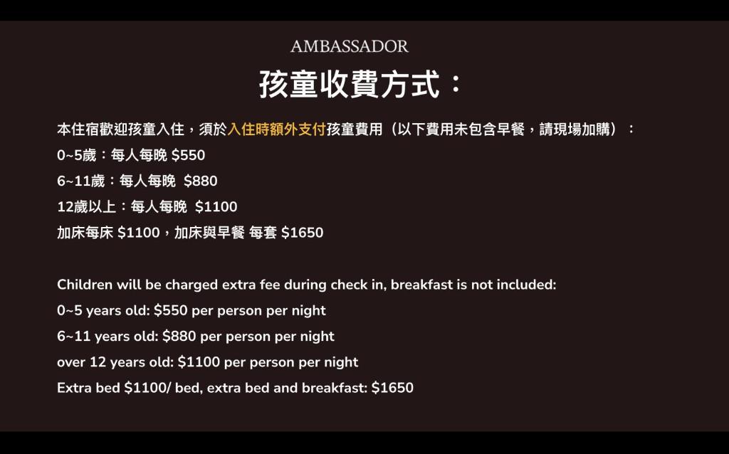 A szálláshely (Ambassador Hotel Hsinchu) szabályzata szerint minden 2 éves és annál idősebb személy felnőttnek minősül, így számukra pótágyat kell igényelni további díj ellenében. További információkat találhat a szálláshely gyermekekre vonatkozó szabályaira vonatkozóan a „Szálláshely szabályzatai” részben a szálláshely adatlapján.
