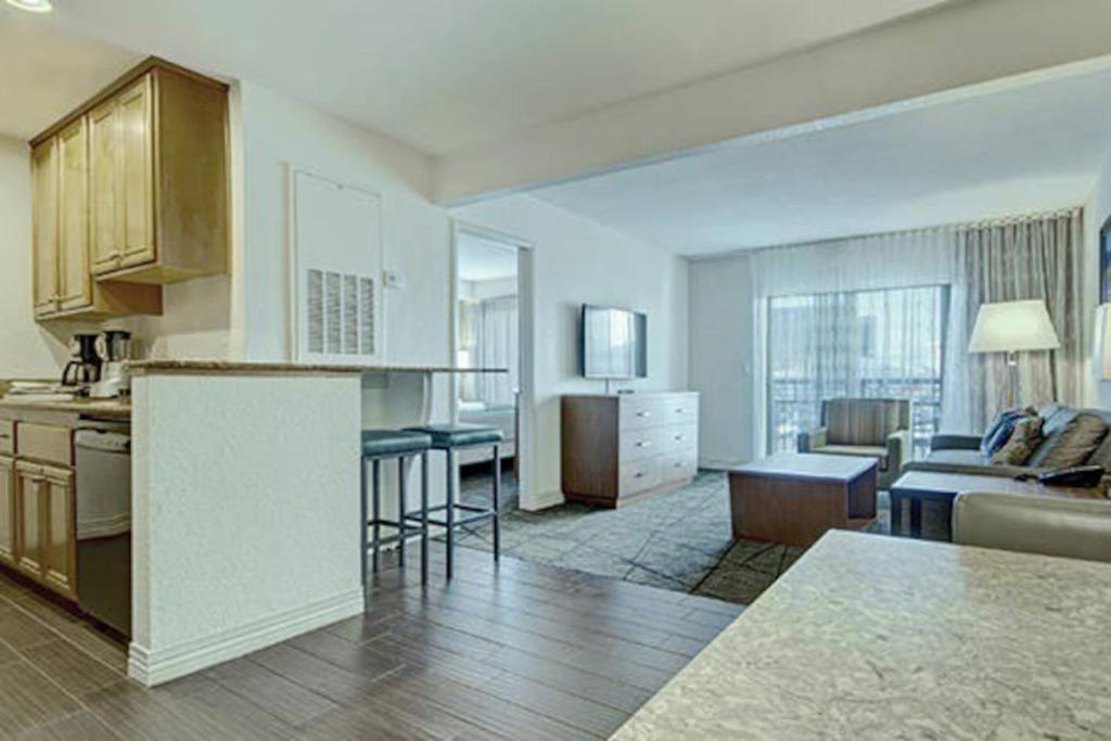 One of the best apartments we have ever stayed in. Very spacious and had everything you could think of including a toaster. Massive fridge freezer too. All the kitchen equipment looked brand new. We had Uber Eats deliver some groceries so had breakfast in the apartment. The bed was enormous and really comfy. Staff were friendly and welcoming. We didn’t realize that you had to ask reception if we wanted our room cleaned so it didn’t get cleaned whilst we were there. Pool area was nice with plenty of beds and there’s a hot tub. There was complimentary ice cream every day at 1pm. On one of the days there was a free beer, cocktail or can of soda from 4pm-5pm. There was bingo on another day with cash prizes to be used at the bar. We ordered food from the bar on our last day. It was roasting hot and good enough for the price. Cheap and cheerful. There’s a small shop at the side of reception that sold a few drinks and snacks as well as painkiller tablets. All reasonably priced. We had to pay an incidentals deposit on arrival which was quickly returned to us the day after we checked out. The hotel is a short walk to MGM Grand reception area where you walk through to access the metro. The metro was easy to use and took us to all the big casinos. We bought a 4-day ticket for about $40 each. The only two negatives I would say are: 1) On arrival at the hotel, we were directed to the desk opposite the reception desk after checking in. The guy at the desk basically tried to convince us to attend a 90-minute talk that would be about us buying a timeshare at a sister hotel. In return we could have heavily discounted tickets to one of the shows or a helicopter ride or an AMEX card preloaded with $100. This is the last thing you want after travelling to Las Vegas! 2) The noise from the nearby construction of the sports stadium next door is horrendous. There was a big machine drilling holes into the ground only feet away from the apartment block at 11pm on our first night. The building work never stopped except on Sunday. It went on for 24 hours a day. There was a noise machine thing in the bedroom that drowned it out. The building work won’t be forever though and wasn’t the hotels' fault. I’m a light sleeper and managed to sleep through the night so I wouldn’t let this put you off too much!