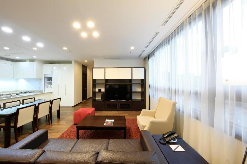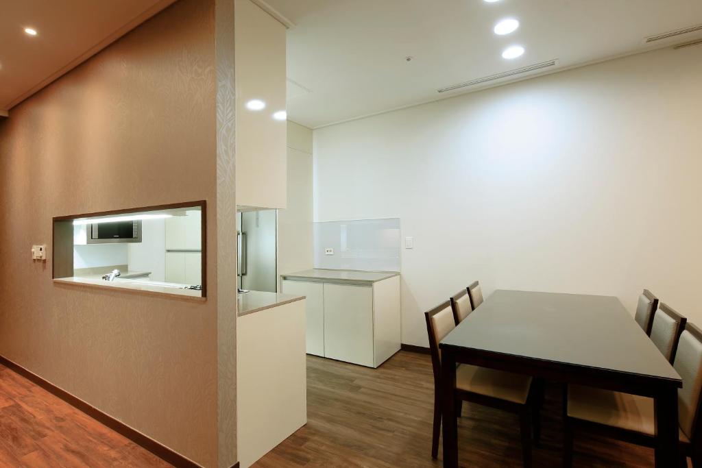 Great value for families. This is an older hotel with spacious living room and kitchen apartments. It has a lot of storage cabinets, and I think there are long-term residents. The beds were ok but not luxurious. Bedding was high quality but mattress could be better. Kitchen has full fridge, microwave, and gas cooktop and oven. You have to turn gas switch to start appliances. Comfortable enough. Didn’t get to try the breakfast buffet or large pool. Rooms below the 16th floor may have views of the run down apartments next door. Highly recommend Alto coffee shop across the street for hand crafted drinks and fresh croissants. Very close to cute Ikseon-dong Hanok Village 익선동 한옥마을 and traditional tea houses.