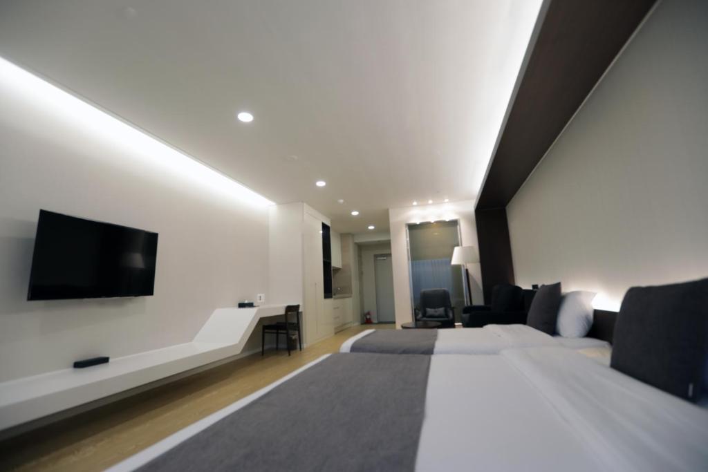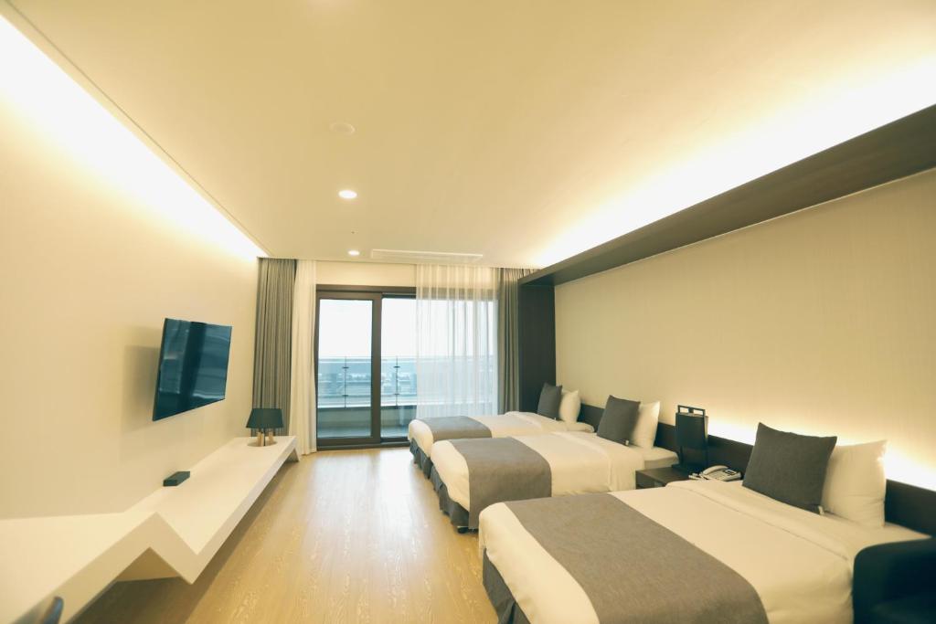 夫と息子と一緒に行きました。客室に入った瞬間、シングルベッドが3つもあるにもかかわらず、全く窮屈さを感じない広々とした空間に「わあ~!!」👍 シャワーブースが分かれているバスルームも非常に広く、シャワーの後に服を着替えるのも全然湿っぽくなくて良かったです。水圧もものすごく強くて良かったです^^ 客室からシャワーブースがすぐ見えるのですが、不透明なガラスなので電気をつけるとシルエットが見えてちょっと焦りました..^^;; 幸い、ソファの背もたれが大きかったので、ガラスの前に並べて置いたらサイズがぴったりで快適に使えました。前のバルコニーからは済州の海が見え、ドアを開けるとすぐに漢拏山が見えて良かったです。静かに休むには散歩に行くのに良かったと思いますが、私たちは一日中出かける予定だったので散歩はパス~^^ ボディウォッシュ、シャンプー、リンスがすべて大きな容器に備え付けられていたのですが、リンスを使うと泡がブクブク..リフィルを間違えたのかフロントに電話したらすぐに新しいものと交換してくれました。客室でコーヒーを飲んでカップを洗おうとしたら洗剤がなかったのでフロントに問い合わせたら、元々ないけど一応台所洗剤をすぐに備え付けてくれると言ってくれました。フロントのスタッフ本当に親切です~♡♡ 残念な点は、鏡がバスルームにしかなく客室にはなくて不便だったこと、タオルがとても古いものが多くて薄かったことです。1人につき2枚の洗面用タオルがあるのですが、旅行の後にシャワーを浴びて夜と朝に1枚ずつ使うには少し大きめで厚手のタオルがあったら良いと思いました。