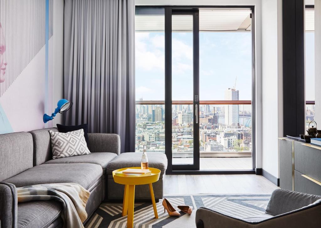 Rommet inkluderer også en mini-bar og et kjøleskap, slik at du kan oppbevare forfriskninger og snacks. Kaffe- og tekoker er tilgjengelig for de som ønsker å starte dagen med en varm drikke. Hver enhet har en egen stue, noe som gir ekstra plass til å slappe av. I tillegg er det en balkong eller terrasse i mange rom, hvor du kan nyte utsikten over New York City. Med blackout gardiner, myke sengetøy og håndklær av høy kvalitet, er The William Vale det ideelle stedet for en avslappende og luksuriøs opplevelse.