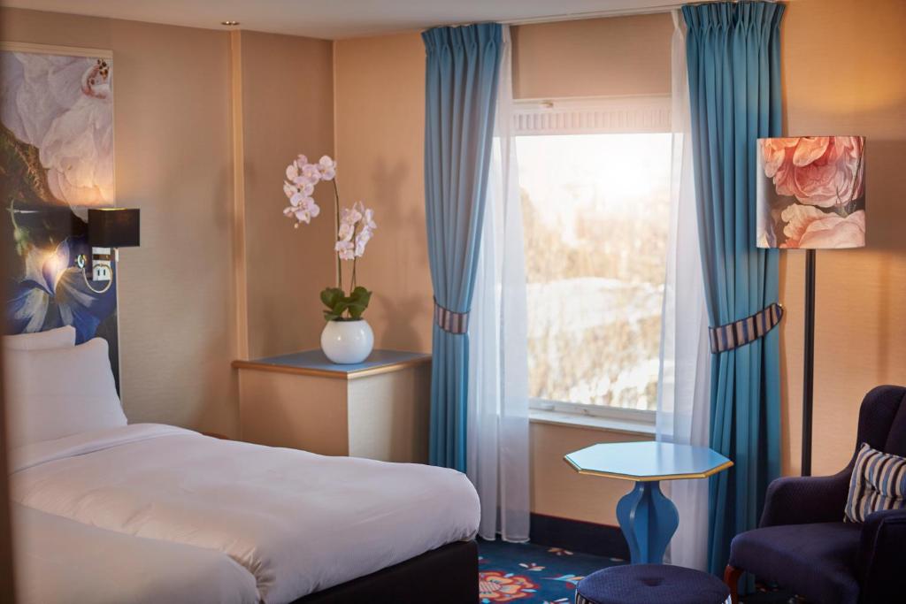 De kamers zijn verder voorzien van een televisie met satelliet- en kabelzenders, wat u de mogelijkheid biedt om te ontspannen en te genieten van uw favoriete programma's na een drukke dag. Voor uw gemak is er ook een minibar aanwezig, ideaal voor een verfrissend drankje of een snack op elk moment van de dag. Bovendien kunt u uw eigen koffie of thee zetten met de handige koffie- en theefaciliteiten. De luxe toiletartikelen maken uw verblijf compleet, terwijl de sfeervolle open haard een warme en gezellige ambiance creëert. Het Carlton Ambassador Hotel biedt u alles wat u nodig heeft voor een onvergetelijk verblijf.