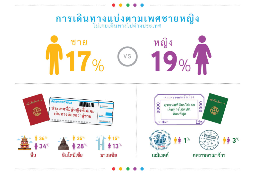 โดยรวมแล้ว มีผู้หญิง 19% ที่ไม่เคยเดินทางออกนอกประเทศบ้านเกิดขณะที่ผู้ชายมีสัดส่วนคิดเป็น 17% มีเพียงสหรัฐอเมริกา เวียดนาม และอินโดนีเซียเท่านั้นที่มีสัดส่วนนักเดินทางเพศชายและหญิงที่แตกต่างกันอย่างชัดเจน โดยหญิงและชายในสหรัฐอเมริกาที่เคยเดินทางไปต่างประเทศอย่างน้อยหนึ่งครั้งมีจำนวนเท่ากับ 66% และ 76% ขณะที่เวียดนามคิดเป็น 67% และ 74% ตามลำดับ ส่วนอินโดนีเซียนั้นมีแนวโน้มตรงกันข้าม โดยจำนวนผู้หญิงที่เคยเดินทางไปต่างประเทศมีมากกว่าผู้ชาย คิดเป็น 72% และ 65% ตามลำดับ