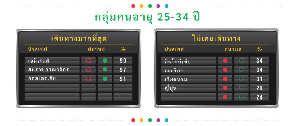 สำหรับกลุ่มคนอายุ 45-54 ปี มี 86% ที่เคยเดินทางไปต่างประเทศแล้ว ส่วนกลุ่มคนอายุ 25-34 ปี มีจำนวน 81%