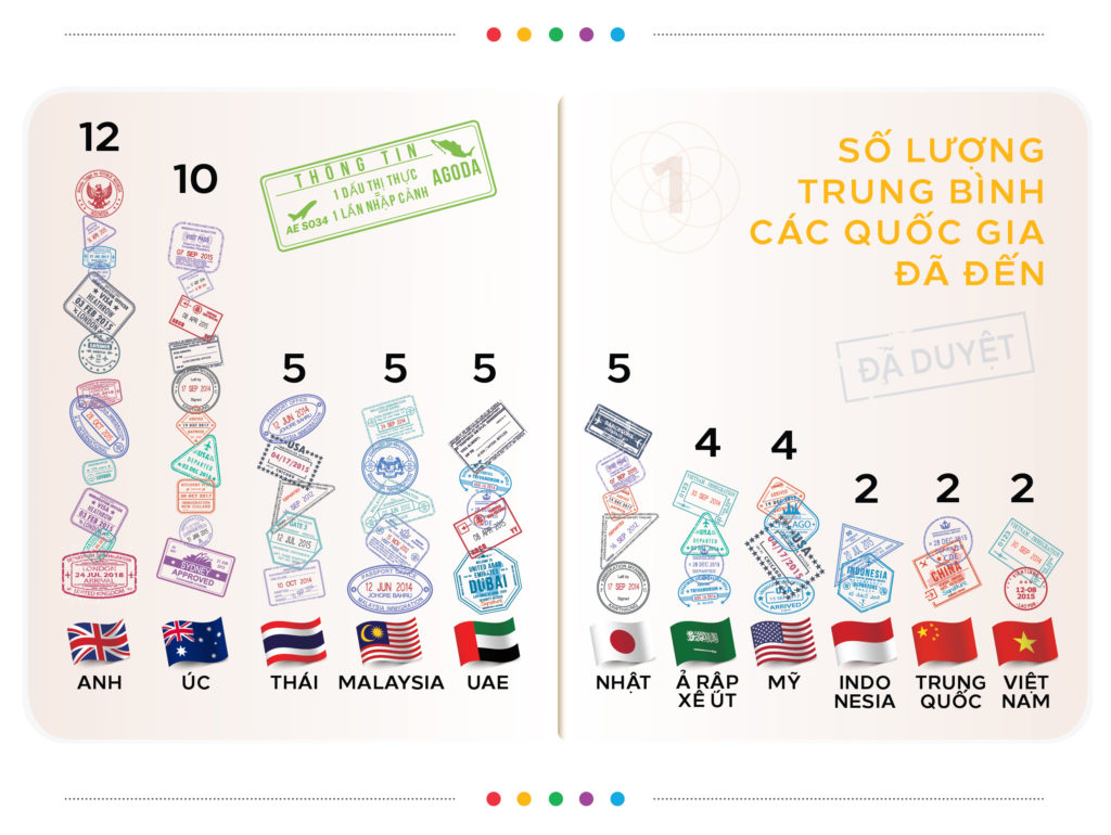 Du khách Anh dẫn đầu thế giới về số lượng quốc gia trung bình một người Anh đã tới là 12 nước, theo sau là du khách Úc với 10 nước. Du khách Việt Nam cùng với Trung Quốc và Indonesia có số lượng quốc gia trung bình từng ghé thăm ít nhất (2 nước).