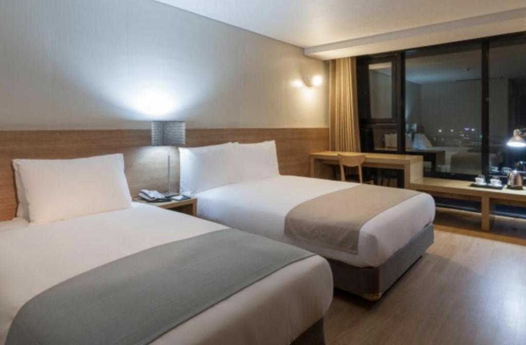 S Hotel Jeju offers a variety of well-designed rooms to suit every traveler's needs. The Deluxe Twin Room provides 27 square meters of space with flexible bedding options, including a single or double bed, perfect for both solo travelers and couples. For families or groups, the Family Twin Room features two double beds within the same spacious area, ensuring a comfortable stay for everyone. Guests seeking a cozy retreat can choose the Standard Double Room, also 27 square meters, with a comfortable double bed. Additionally, the hotel offers a Standard Twin on the 2nd floor equipped with a high-performing PC and a non-smoking environment, ideal for business or leisure travelers who value connectivity and comfort. The Standard Double (Ace Bed) room combines style and convenience, with access to popular streaming services like Netflix, Tving, Disney, and YouTube, making it a perfect choice for entertainment lovers.