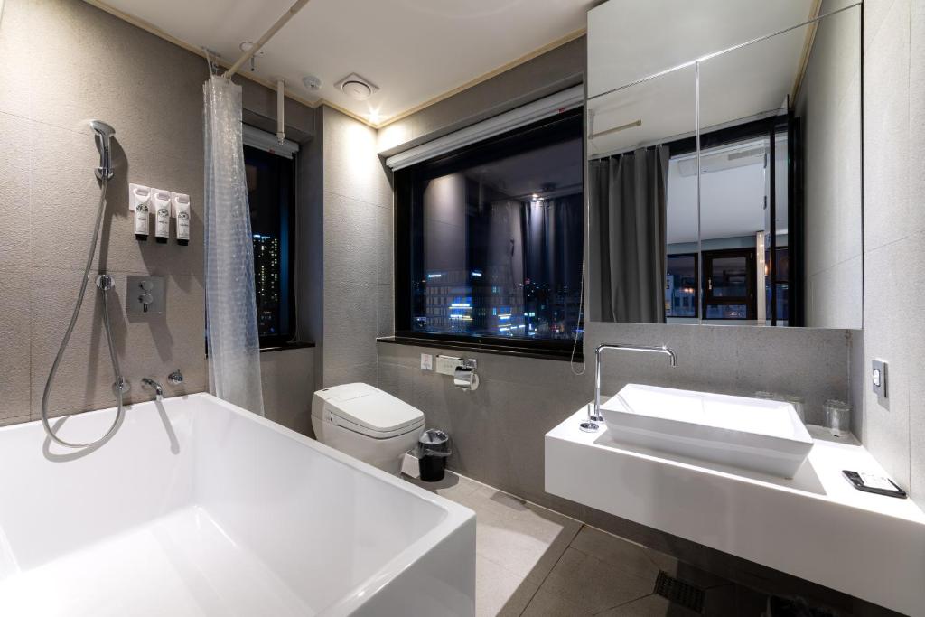 I was in Seoul for a couple of days so I needed a place. I am really glad i booked this hotel. The personnel at the front desk spoke decent English so that made checking in very easy. The hotel room was clean and the bathroom was very nice it had a rain shower head and a bidet toilet. There was also a really nice tub. By the window, I stayed in a corner room on the 15th floor so I had a really good view of the city. The bed was firm, but comfortable. Check out was at noon and when I checked out I was able to leave my luggage with them so I could continue exploring Seoul until my train arrived later that night. All in all a very pleasant experience.