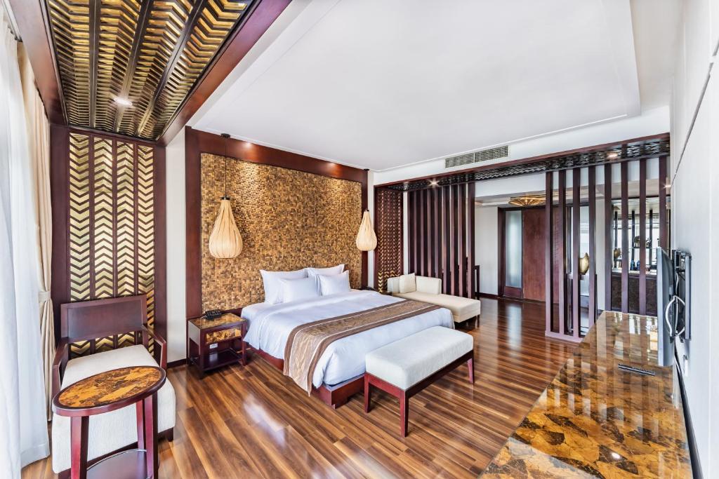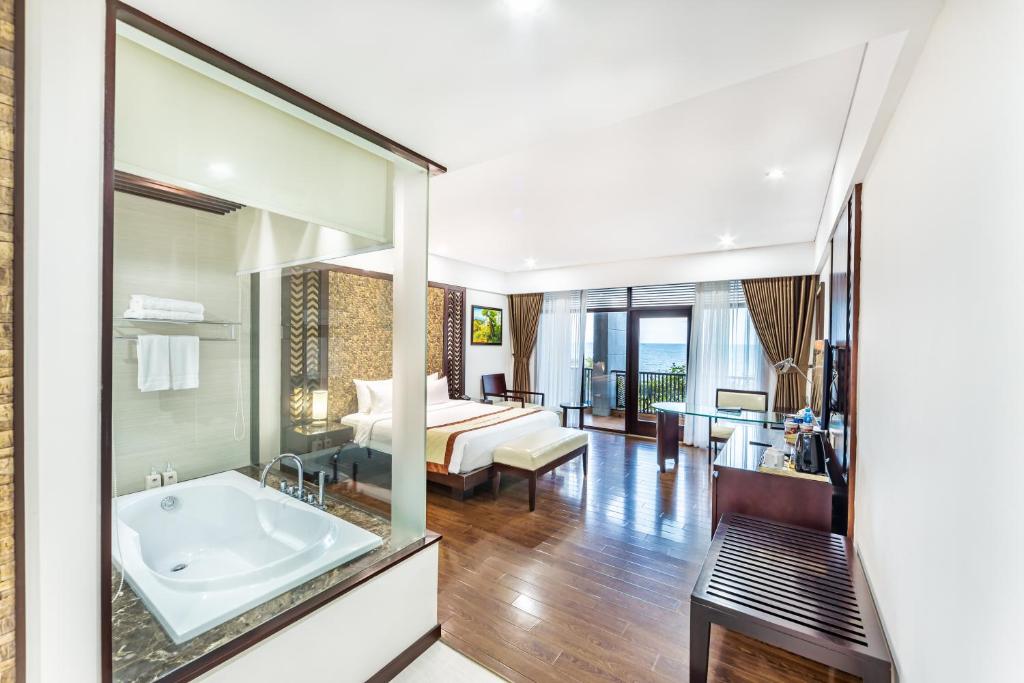 Phòng rộng và nội thất màu gỗ đẹp, sang trọng. Thú vị nhất là bộ điều khiển ánh sáng cả phòng bên cạnh giường ngủ. và đèn bố trí khá tiện ích. Bathroom rộng có 🛁 sạch. Duy có 1 điểm chưa thấy hài lòng là xg check out sớm từ lúc vắng mà vẫn fai đợi lâu do cô lễ tân cứ nói đi nói lại vs 1 đoàn khách nào đó chuyện thiếu 1 cái 🥄 muỗng. Là chất lượng cao cấp rùi thì ko nên vì một chuyện nhỏ nhặt như vậy làm mất thời gian của các khách khác. Vì nó quá nhỏ, có nhiều cách xử lý nhanh chóng hơn! Nói chung view đẹp, bãi tắm cg vắng thưa th mái tắm, bể bơi cg rất thích và sạch sẽ.
